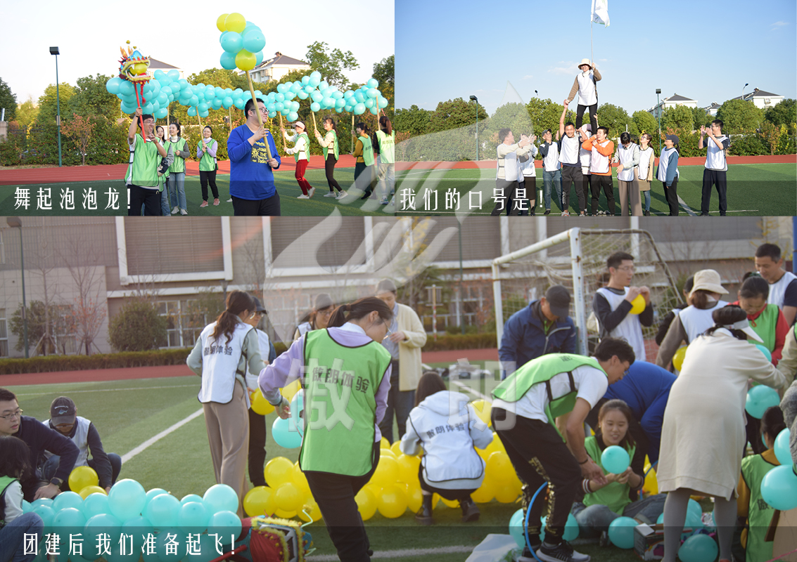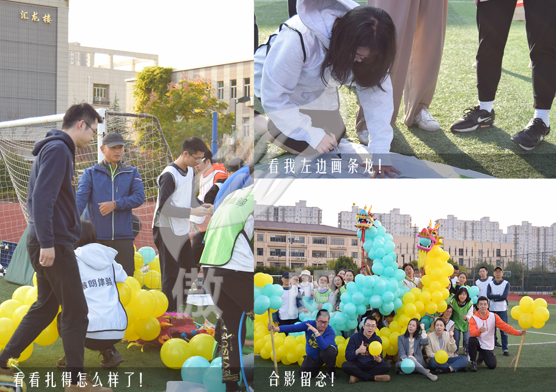 2020年11月,留云中學的伙伴們在學校里開展了團建活動,操場上大家排成一排做熱身,破冰分組小游戲,快速打破社交障礙熟悉伙伴,組建團隊,用五彩的氣球慢慢綁在一起,組建成一條巨龍,畫龍點睛,舞龍逐珠。