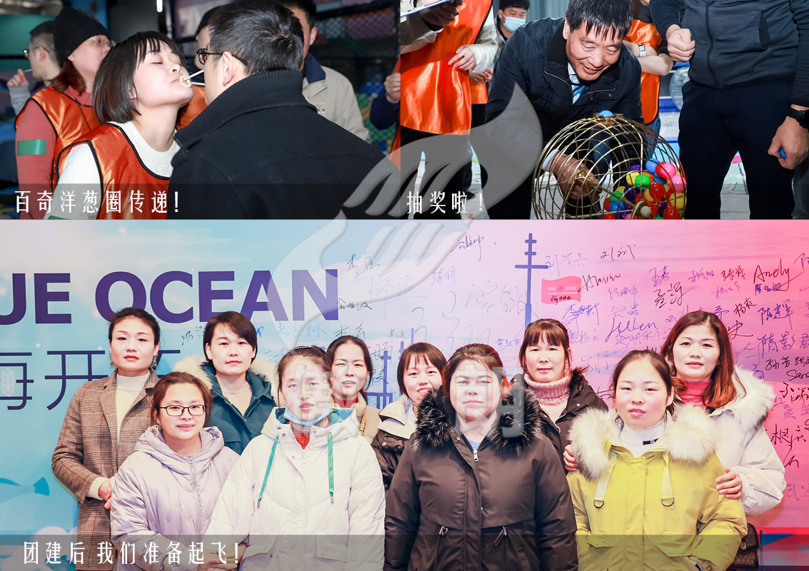 2020年12月,玫瑰塑膠的伙伴們在昆山蘭博基尼酒店開展了以“藍海開拓”為主題的年會團建活動,以公司的形象和產品為要素,現場搭建兩艘紅海和藍海的大船,描繪上公司的理念和產品等,寄予新一年美好的期望。