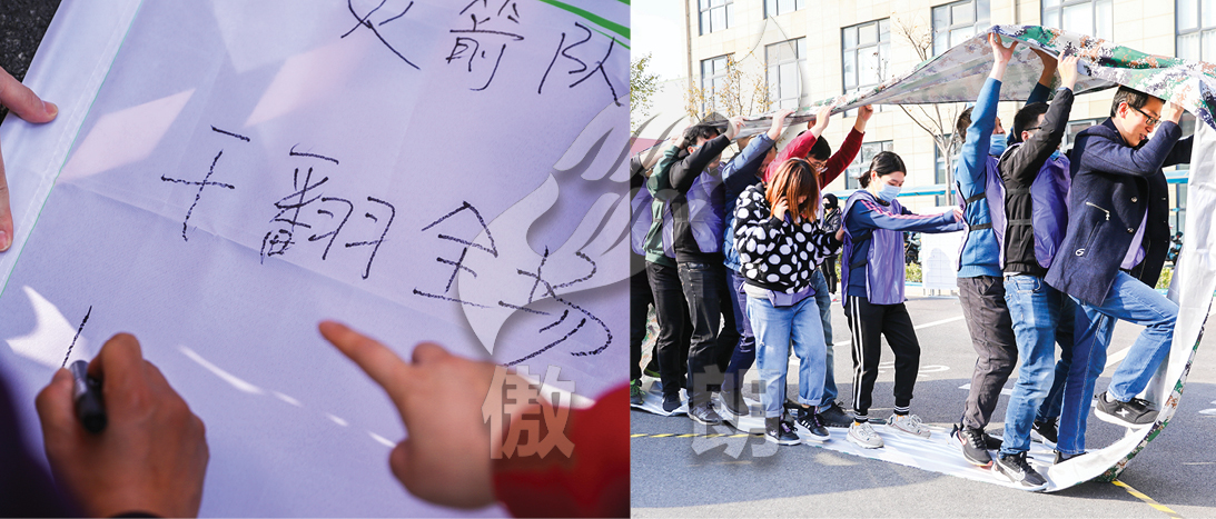 第一個項目:雷霆戰(zhàn)鼓/眾星捧月,由1個圓鼓,彩云球和把手或繩子組成,培養(yǎng)團隊的協(xié)作能力,在團體共同的努力下支撐“一片云彩”。