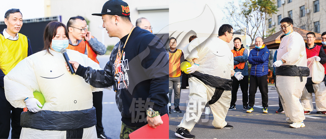 超級相撲,由2套相撲服、2個護頭帽和2個半圓墊子組合,把2個半圓墊組成一個圓形保護區(qū),2個比賽人員著裝好相撲服和護頭帽進行比賽,