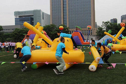 充氣大作戰,是一項集趣味、競技、娛樂、健身為一體的項目,在隊員參與項目過程中,可以進行多種不同的趣味游戲活動。促進了團隊有效溝通,同時自身的平衡力與協調性也得到提高,只有內外的溝通與配合,才能實現速度最大化。